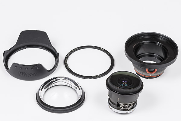 That is when I first got the idea to split this lens into two components! On the basis of the patent data and by measuring the internal dimensions of the lens housing I calculated the distance between the front lens element and the inner group of lenses. I constructed an aluminium ring with a SEACAM thread for the front lens element. I even used the original Nikonos plastic lens hood and a ring around the front lens element with a serial number of the lens. I also constructed a new housing for the internal group of lenses. As a result, I got a new lens and a dome port, which operate properly only when they are placed together.
