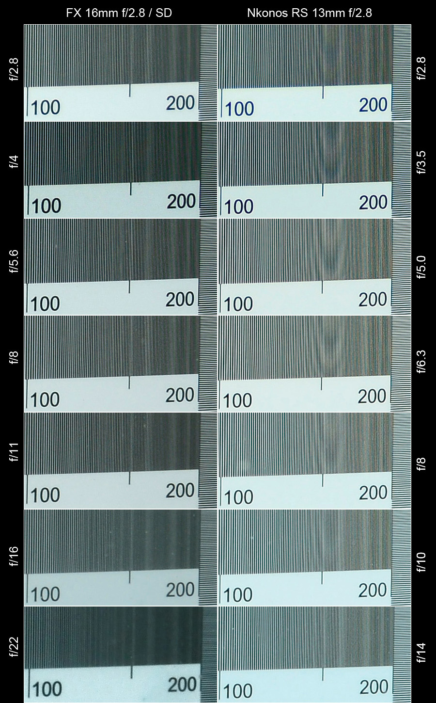 It is necessary to clarify Nikon's nomenclature in the expression “focal length” of underwater lenses. The term comes already from the times of the French camera Calypso (invented by Jean de Wouters), for which Nikon purchased a license in 1963 and had begun to produce its Nikonos series. Then, the original 35 mm amphibian lens had approximately the same underwater viewing angle as the 50 mm landlens had on surface. When Nikon produced the first underwater-only lens (28mm f/3.5), it was marked "28mm", although the underwater viewing angle was similar to the 35 mm land lens. To obtain the real focal length, which gives us the right information of the viewing angle, the nominal focal length must be multiplied by a factor of 1.33 (the refractive index of water). Since this nomenclature was implemented by Nikon for the RS series lenses as well, the real focal lengths are as follows: 17 mm (for 13/2.8), 27-47 mm (for 20-35/2.8), 37 mm (for 28/2.8) and 67 mm (for 50/2.8).