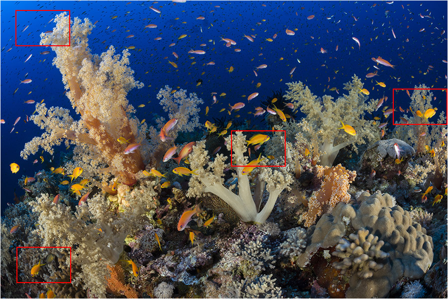The image below (ISO 400, f/22 (effective f/14), 1/80) shows that fishes (in the background) in the upper image corners are much sharper than the rocks and corals in the lower image corners which are too close. It can also be noticed that the top of the left soft coral is quite blurred (because it is too close) but fishes in the background behind it are sharp.